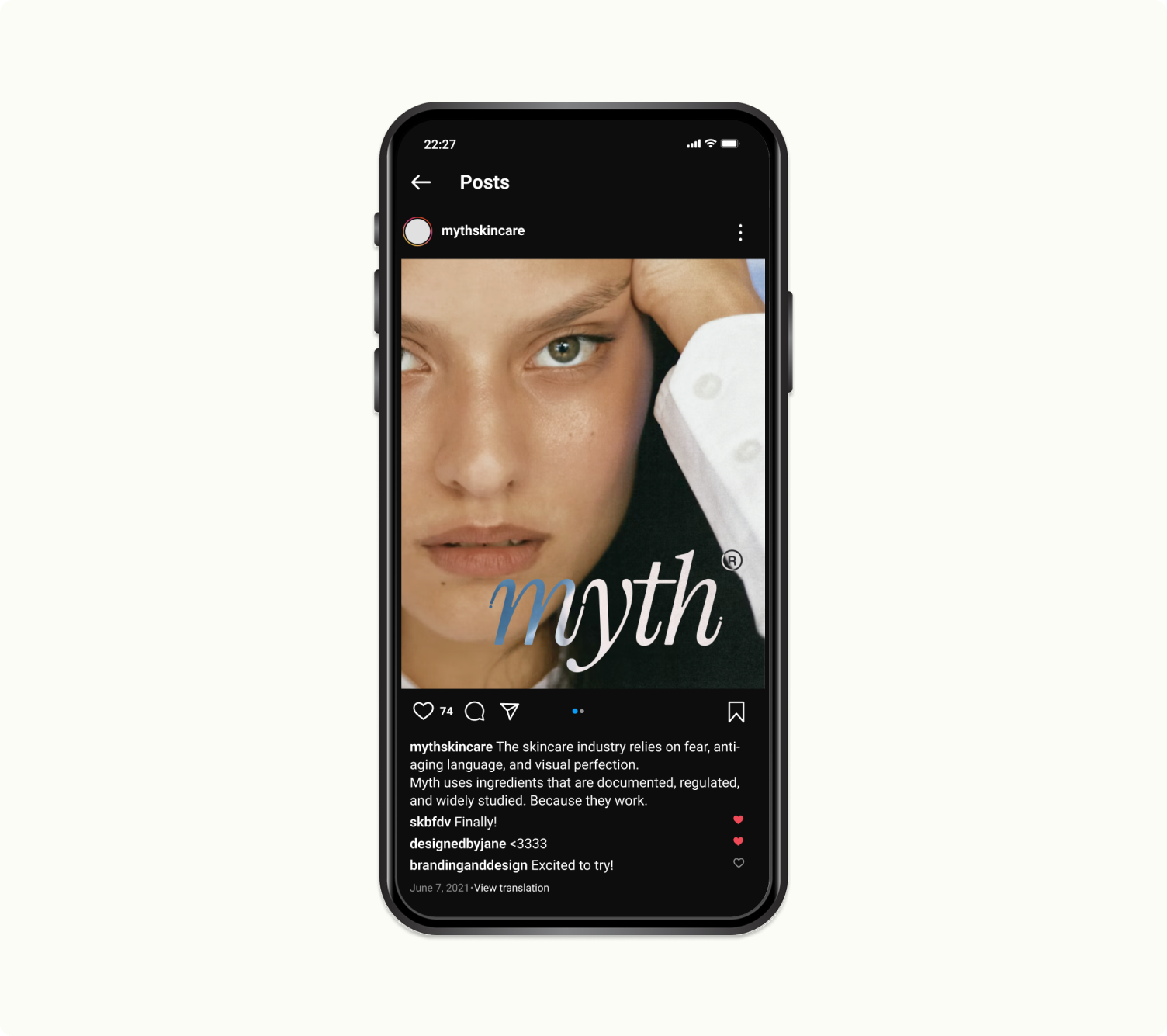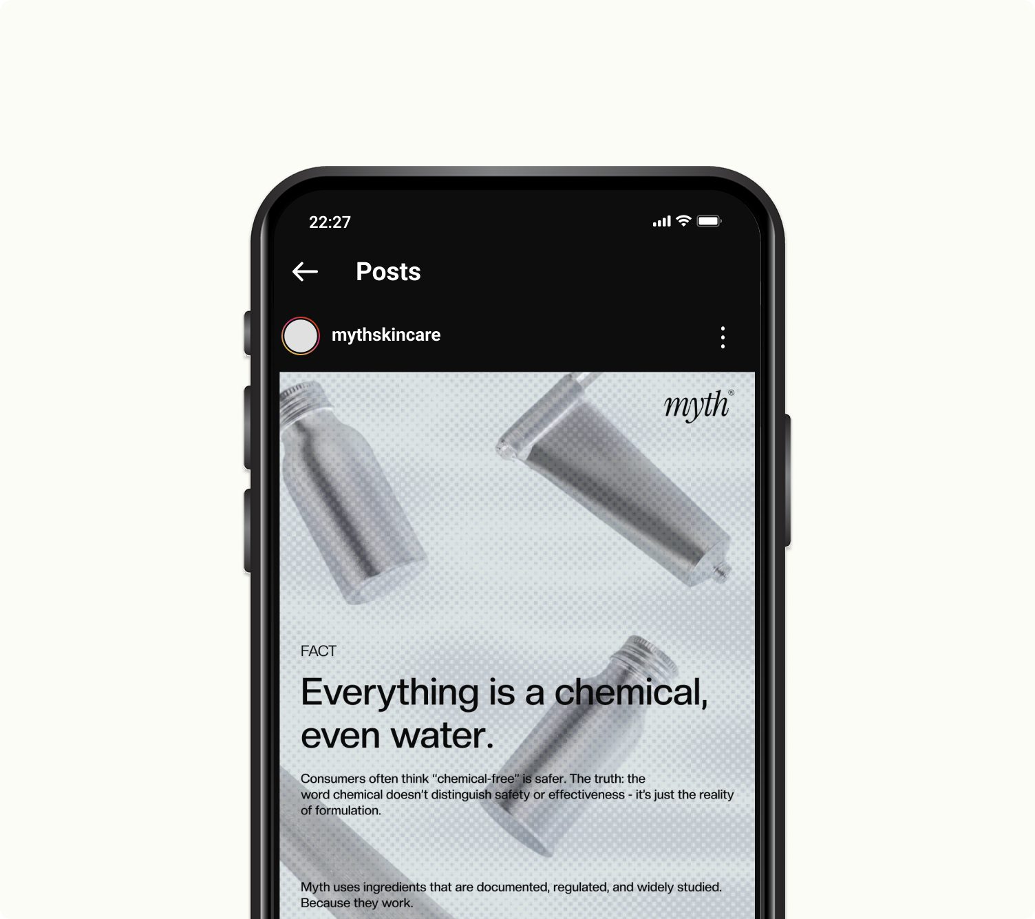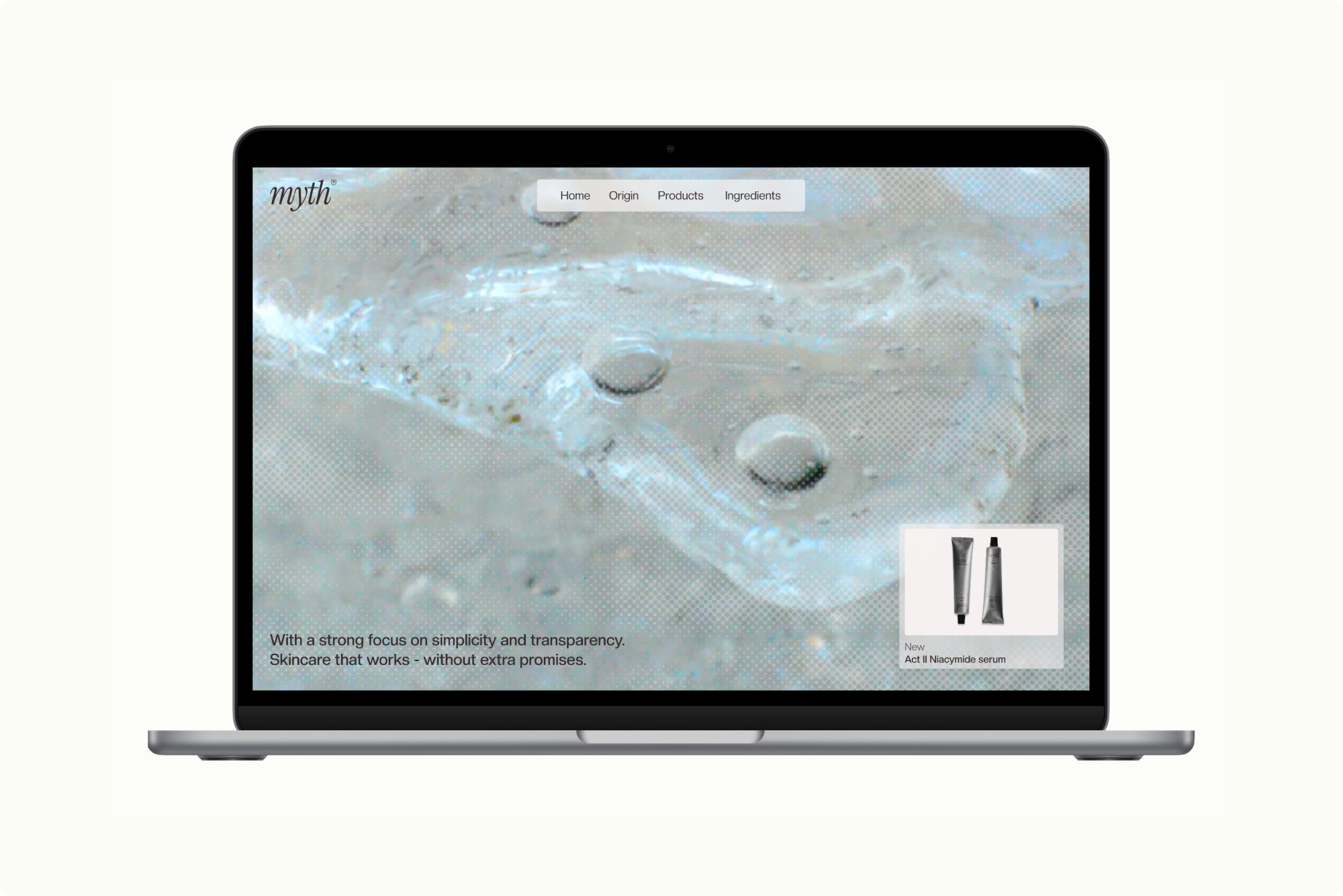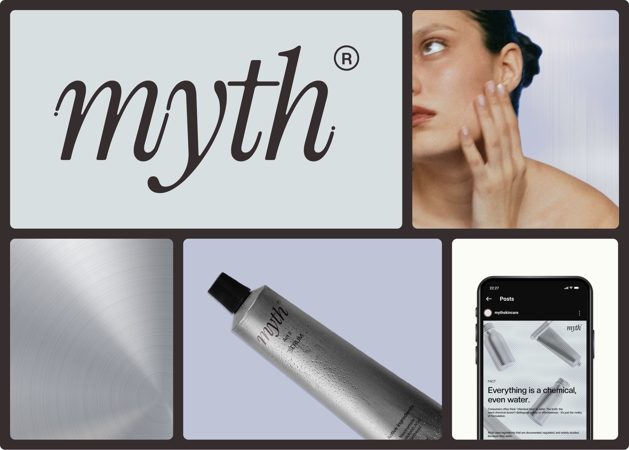Myth is a fictional skincare brand built on transparency and evidence rather than aspiration. It speaks to an audience seeking clarity in an industry driven by promises and perfection. The brand values restraint, scientific credibility, and direct communication, emphasizing that skincare can support the skin, but won't fix life or stop time.